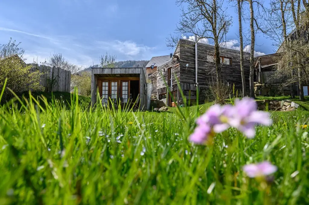 Wiesen, Licht und Naturmaterialien treffen auf Sauna, Ruhebereiche, Weitblick und Waldwege. -